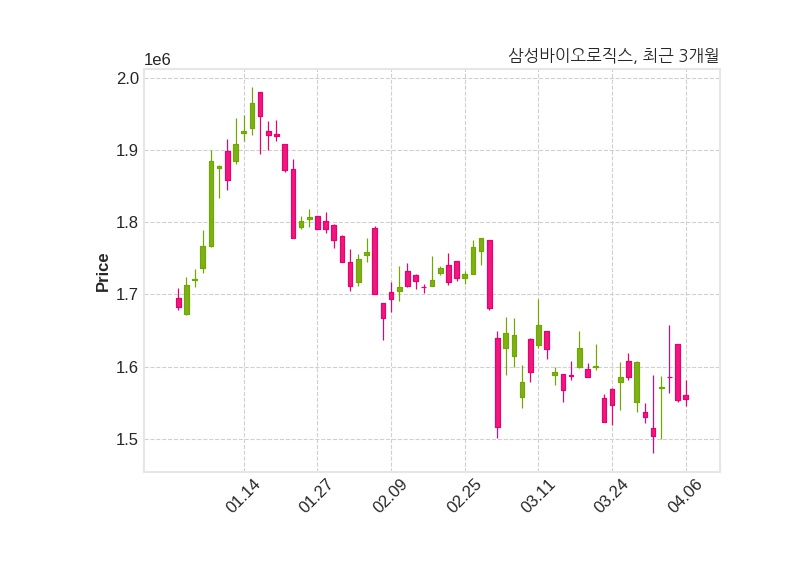 한편, 삼성바이오로직스는 장 마감 이후 해당 기업공시를 발표했으며 오늘 종가가 1,555,000원, 거래량은 25,964주로, 직전 거래일 대비 1,000원(+0.06%) 상승했다.
