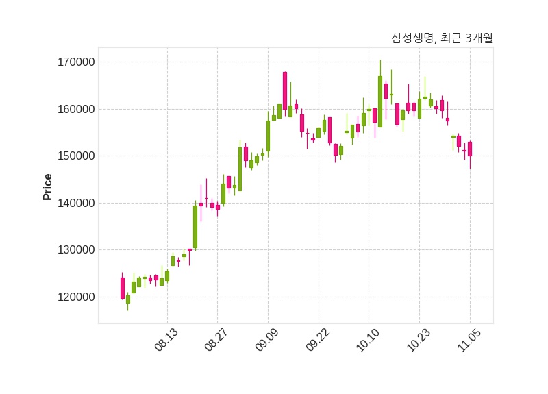 한편, 삼성생명은 장 마감 이후 해당 기업공시를 발표했으며 오늘 종가가 150,000원, 거래량은 319,753주로, 직전 거래일 대비 1,100원(-0.73%) 하락했다.