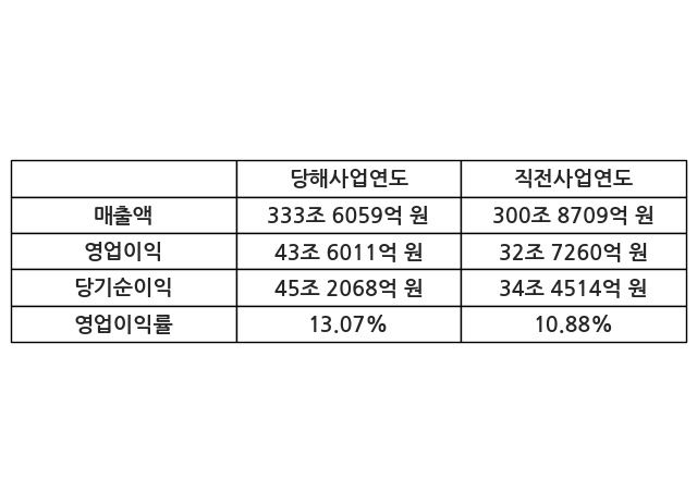 이번사업연도의 매출액은 직전사업연도 대비 10.88% 증가한 333조 6059억 원, 영업이익은 43조 6011억 원, 당기순이익은 45조 2068억 원이라고 공시했다.