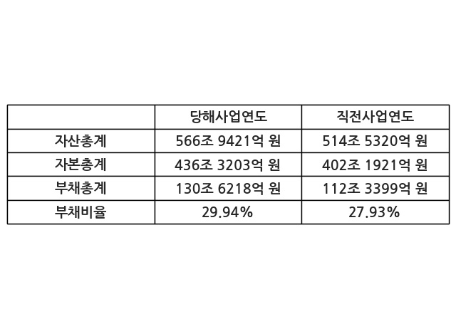 또한, 이번사업연도의 자산총계는 566조 9421억 원으로 직전사업연도 대비 10.19% 증가한 한편, 부채총계는 130조 6218억 원으로 16.27% 증가, 자본총계는 436조 3203억 원으로 8.49% 증가했다.
