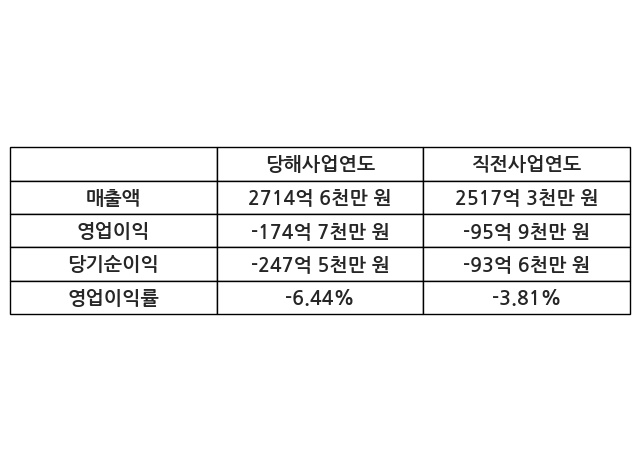이번사업연도의 매출액은 직전사업연도 대비 7.84% 증가한 2714억 6천만 원, 영업이익은 -174억 7천만 원, 당기순이익은 -247억 5천만 원이라고 공시했다.