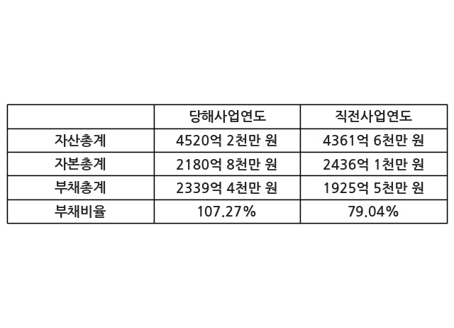 또한, 이번사업연도의 자산총계는 4520억 2천만 원으로 직전사업연도 대비 3.63% 증가한 한편, 부채총계는 2339억 4천만 원으로 21.49% 증가, 자본총계는 2180억 8천만 원으로 -10.48% 감소했다.