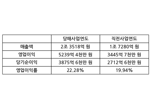 이번사업연도의 매출액은 직전사업연도 대비 36.1% 증가한 2조 3518억 원, 영업이익은 5239억 4천만 원, 당기순이익은 3875억 6천만 원이라고 공시했다.