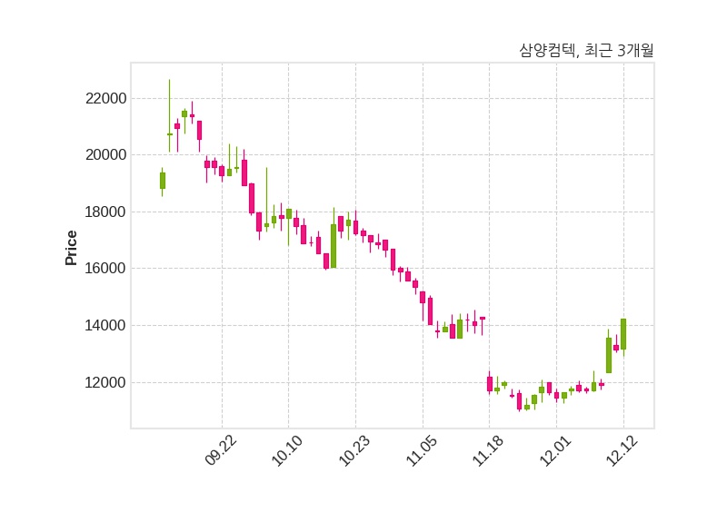 한편, 삼양컴텍의 15시 11분 현재주가는 14,220원으로 직전 거래일 대비 1,080원(+8.22%) 상승이며, 거래량은 1,284,641주이다.