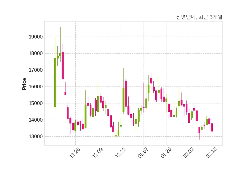 한편, 삼영엠텍은 장 마감 이후 해당 기업공시를 발표했으며 오늘 종가가 13,320원, 거래량은 178,108주로, 직전 거래일 대비 460원(-3.34%) 하락했다.