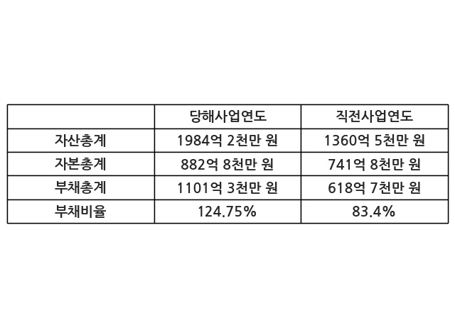 또한, 이번사업연도의 자산총계는 1984억 2천만 원으로 직전사업연도 대비 45.84% 증가한 한편, 부채총계는 1101억 3천만 원으로 78.02% 증가, 자본총계는 882억 8천만 원으로 19.01% 증가했다.