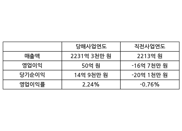 이번사업연도의 매출액은 직전사업연도 대비 0.83% 증가한 2231억 3천만 원, 영업이익은 50억 원, 당기순이익은 14억 9천만 원이라고 공시했다.