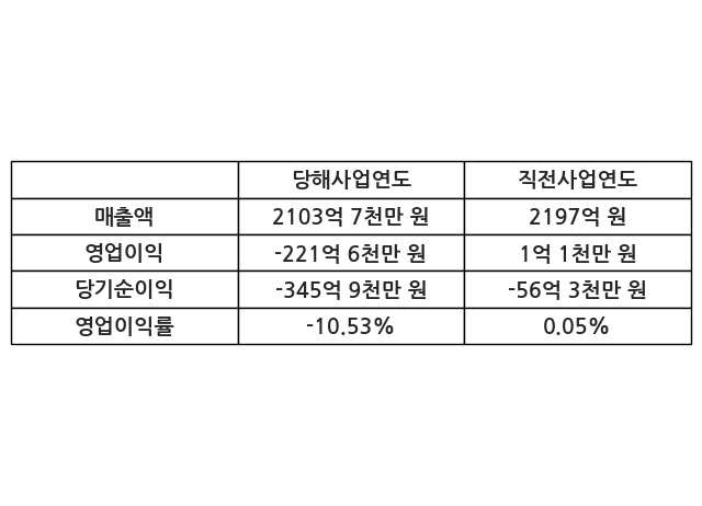 이번사업연도의 매출액은 직전사업연도 대비 -4.25% 감소한 2103억 7천만 원, 영업이익은 -221억 6천만 원, 당기순이익은 -345억 9천만 원이라고 공시했다.