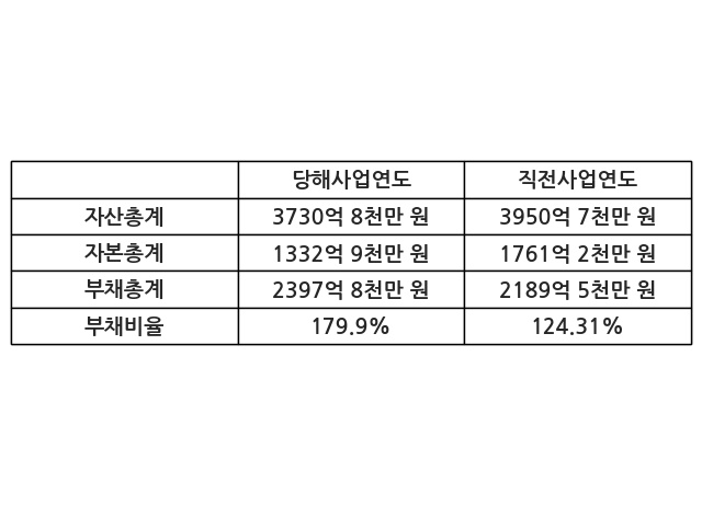 또한, 이번사업연도의 자산총계는 3730억 8천만 원으로 직전사업연도 대비 -5.57% 감소한 한편, 부채총계는 2397억 8천만 원으로 9.52% 증가, 자본총계는 1332억 9천만 원으로 -24.32% 감소했다.