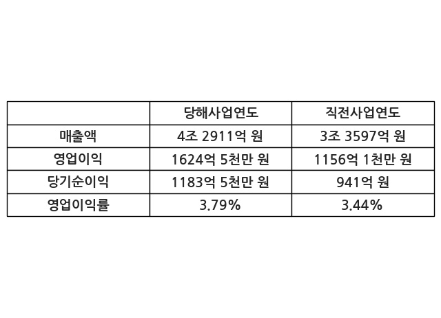 이번사업연도의 매출액은 직전사업연도 대비 27.72% 증가한 4조 2911억 원, 영업이익은 1624억 5천만 원, 당기순이익은 1183억 5천만 원이라고 공시했다.