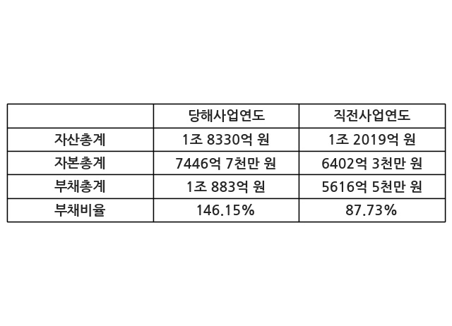 또한, 이번사업연도의 자산총계는 1조 8330억 원으로 직전사업연도 대비 52.51% 증가한 한편, 부채총계는 1조 883억 원으로 93.77% 증가, 자본총계는 7446억 7천만 원으로 16.31% 증가했다.