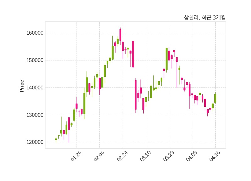 한편, 삼천리는 장 마감 이후 해당 기업공시를 발표했으며 오늘 종가가 137,500원, 거래량은 16,480주로, 직전 거래일 대비 3,400원(+2.54%) 상승했다.