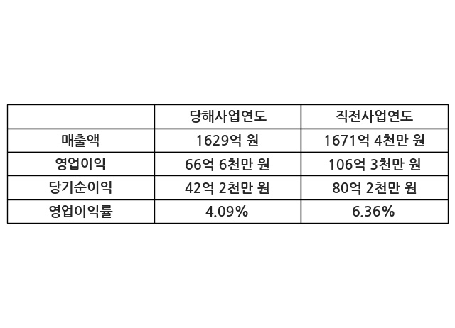 이번사업연도의 매출액은 직전사업연도 대비 -2.54% 감소한 1629억 원, 영업이익은 66억 6천만 원, 당기순이익은 42억 2천만 원이라고 공시했다.