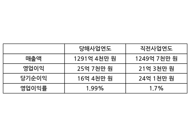 이번사업연도의 매출액은 직전사업연도 대비 3.34% 증가한 1291억 4천만 원, 영업이익은 25억 7천만 원, 당기순이익은 16억 4천만 원이라고 공시했다.