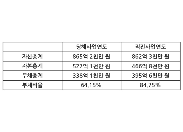 또한, 이번사업연도의 자산총계는 865억 2천만 원으로 직전사업연도 대비 0.33% 증가한 한편, 부채총계는 338억 1천만 원으로 -14.52% 감소, 자본총계는 527억 1천만 원으로 12.92% 증가했다.