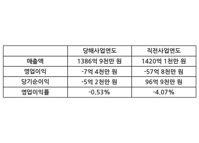 이번사업연도의 매출액은 직전사업연도 대비 -2.33% 감소한 1386억 9천만 원, 영업이익은 -7억 4천만 원, 당기순이익은 -5억 2천만 원이라고 공시했다.