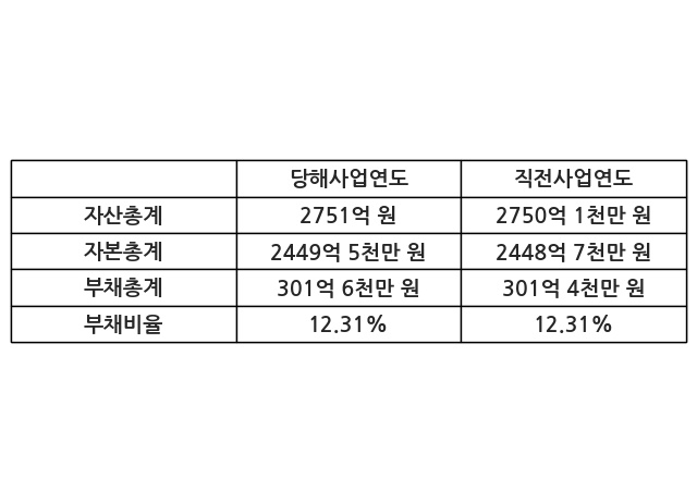 또한, 이번사업연도의 자산총계는 2751억 원으로 직전사업연도 대비 0.03% 증가한 한편, 부채총계는 301억 6천만 원으로 0.05% 증가, 자본총계는 2449억 5천만 원으로 0.03% 증가했다.