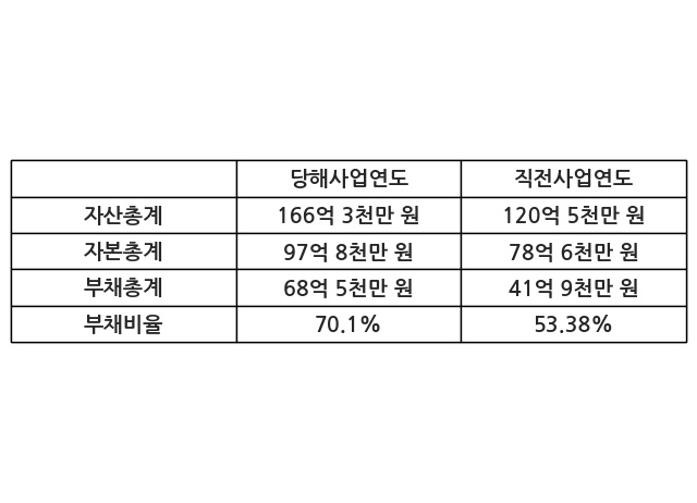 또한, 이번사업연도의 자산총계는 166억 3천만 원으로 직전사업연도 대비 38.01% 증가한 한편, 부채총계는 68억 5천만 원으로 63.41% 증가, 자본총계는 97억 8천만 원으로 24.45% 증가했다.