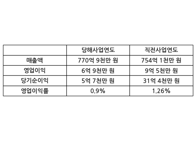 이번사업연도의 매출액은 직전사업연도 대비 2.23% 증가한 770억 9천만 원, 영업이익은 6억 9천만 원, 당기순이익은 5억 7천만 원이라고 공시했다.