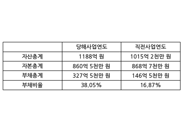 또한, 이번사업연도의 자산총계는 1188억 원으로 직전사업연도 대비 17.01% 증가한 한편, 부채총계는 327억 5천만 원으로 123.49% 증가, 자본총계는 860억 5천만 원으로 -0.94% 감소했다.
