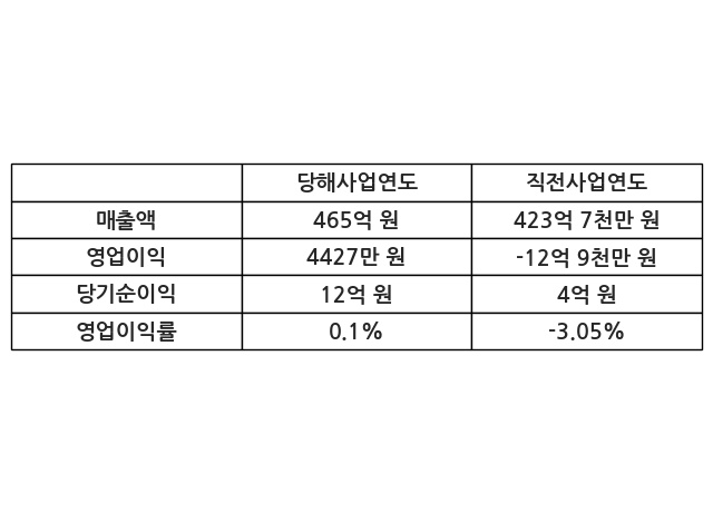 이번사업연도의 매출액은 직전사업연도 대비 9.75% 증가한 465억 원, 영업이익은 4427만 원, 당기순이익은 12억 원이라고 공시했다.