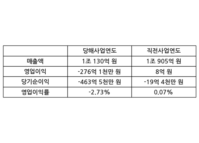 이번사업연도의 매출액은 직전사업연도 대비 -7.1% 감소한 1조 130억 원, 영업이익은 -276억 1천만 원, 당기순이익은 -463억 5천만 원이라고 공시했다.