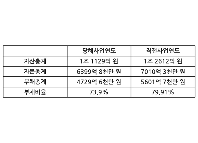 또한, 이번사업연도의 자산총계는 1조 1129억 원으로 직전사업연도 대비 -11.76% 감소한 한편, 부채총계는 4729억 6천만 원으로 -15.57% 감소, 자본총계는 6399억 8천만 원으로 -8.71% 감소했다.