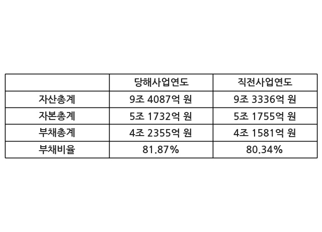 또한, 이번사업연도의 자산총계는 9조 4087억 원으로 직전사업연도 대비 0.8% 증가한 한편, 부채총계는 4조 2355억 원으로 1.86% 증가, 자본총계는 5조 1732억 원으로 -0.04% 감소했다.