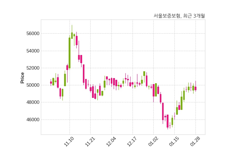 한편, 서울보증보험의 14시 28분 현재주가는 49,450원으로 직전 거래일 대비 450원(-0.9%) 하락이며, 거래량은 44,749주이다.