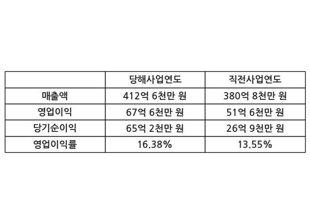 이번사업연도의 매출액은 직전사업연도 대비 8.34% 증가한 412억 6천만 원, 영업이익은 67억 6천만 원, 당기순이익은 65억 2천만 원이라고 공시했다.