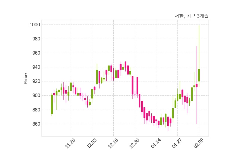 한편, 서한의 14시 01분 현재주가는 964원으로 직전 거래일 대비 52원(+5.7%) 상승이며, 거래량은 621,791주이다.