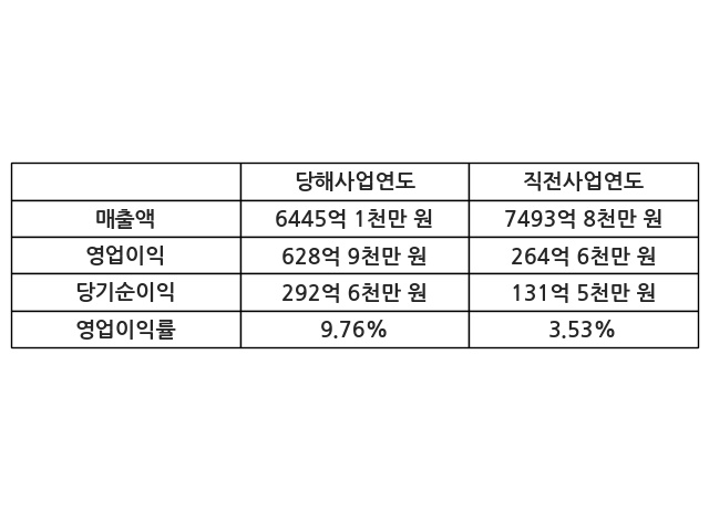 이번사업연도의 매출액은 직전사업연도 대비 -14.0% 감소한 6445억 1천만 원, 영업이익은 628억 9천만 원, 당기순이익은 292억 6천만 원이라고 공시했다.