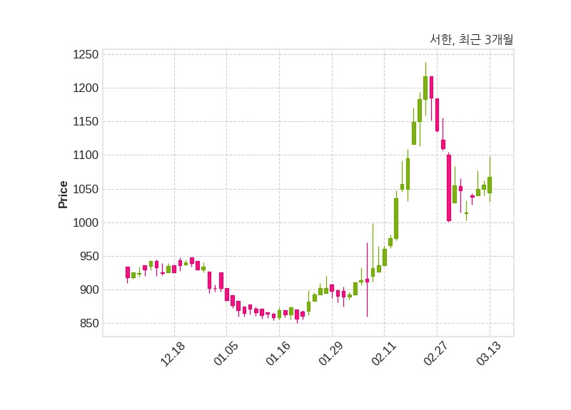 한편, 서한의 14시 38분 현재주가는 1,068원으로 직전 거래일 대비 12원(+1.14%) 상승이며, 거래량은 196,033주이다.