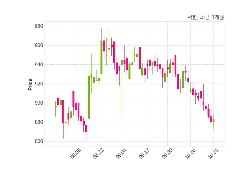 한편, 서한의 13시 23분 현재주가는 883원으로 직전 거래일 대비 3원(+0.34%) 상승이며, 거래량은 152,237주이다.