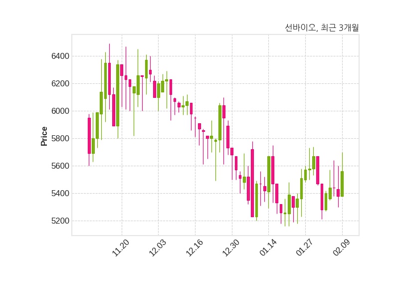 한편, 선바이오의 11시 27분 현재주가는 5,560원으로 직전 거래일 대비 180원(+3.35%) 상승이며, 거래량은 29,872주이다.