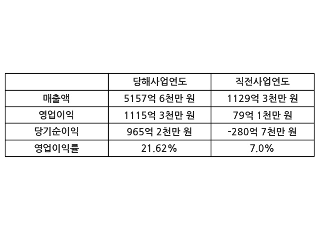 이번사업연도의 매출액은 직전사업연도 대비 356.73% 증가한 5157억 6천만 원, 영업이익은 1115억 3천만 원, 당기순이익은 965억 2천만 원이라고 공시했다.