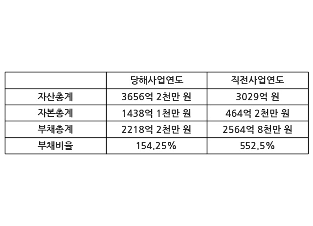 또한, 이번사업연도의 자산총계는 3656억 2천만 원으로 직전사업연도 대비 20.71% 증가한 한편, 부채총계는 2218억 2천만 원으로 -13.51% 감소, 자본총계는 1438억 1천만 원으로 209.79% 증가했다.
