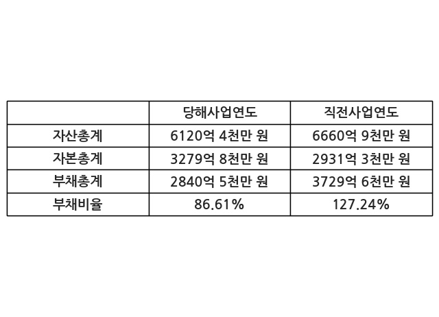 또한, 이번사업연도의 자산총계는 6120억 4천만 원으로 직전사업연도 대비 -8.12% 감소한 한편, 부채총계는 2840억 5천만 원으로 -23.84% 감소, 자본총계는 3279억 8천만 원으로 11.89% 증가했다.