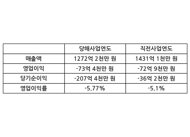 이번사업연도의 매출액은 직전사업연도 대비 -11.1% 감소한 1272억 2천만 원, 영업이익은 -73억 4천만 원, 당기순이익은 -207억 4천만 원이라고 공시했다.