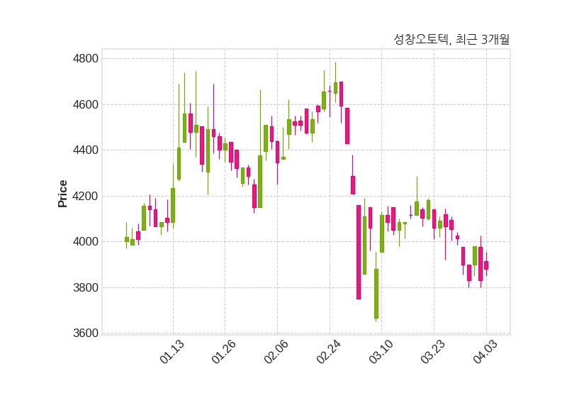 한편, 성창오토텍은 장 마감 이후 해당 기업공시를 발표했으며 오늘 종가가 3,880원, 거래량은 8,951주로, 직전 거래일 대비 50원(+1.31%) 상승했다.