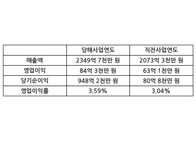 이번사업연도의 매출액은 직전사업연도 대비 13.33% 증가한 2349억 7천만 원, 영업이익은 84억 3천만 원, 당기순이익은 948억 2천만 원이라고 공시했다.