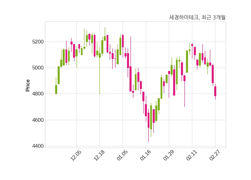 한편, 세경하이테크의 14시 38분 현재주가는 4,785원으로 직전 거래일 대비 100원(-2.05%) 하락이며, 거래량은 180,897주이다.