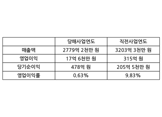 이번사업연도의 매출액은 직전사업연도 대비 -13.24% 감소한 2779억 2천만 원, 영업이익은 17억 6천만 원, 당기순이익은 478억 원이라고 공시했다.