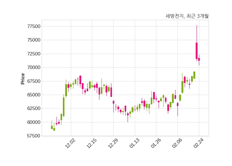 한편, 세방전지는 장 마감 이후 해당 기업공시를 발표했으며 오늘 종가가 71,300원, 거래량은 55,179주로, 직전 거래일 대비 300원(-0.42%) 하락했다.