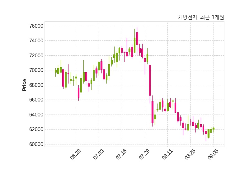 한편, 세방전지는 장 마감 이후 해당 기업공시를 발표했으며 오늘 종가가 62,200원, 거래량은 24,359주로, 직전 거래일 대비 200원(+0.32%) 상승했다.
