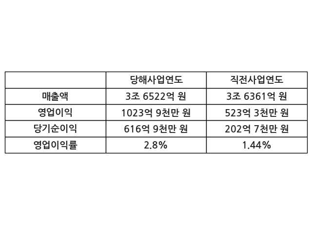 이번사업연도의 매출액은 직전사업연도 대비 0.44% 증가한 3조 6522억 원, 영업이익은 1023억 9천만 원, 당기순이익은 616억 9천만 원이라고 공시했다.