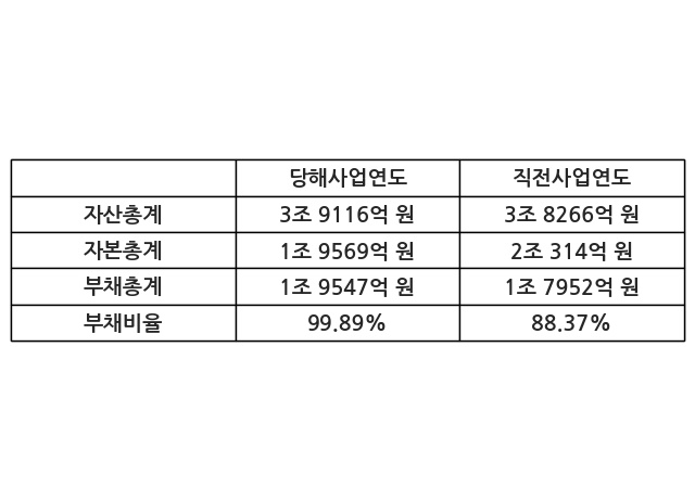 또한, 이번사업연도의 자산총계는 3조 9116억 원으로 직전사업연도 대비 2.22% 증가한 한편, 부채총계는 1조 9547억 원으로 8.88% 증가, 자본총계는 1조 9569억 원으로 -3.67% 감소했다.