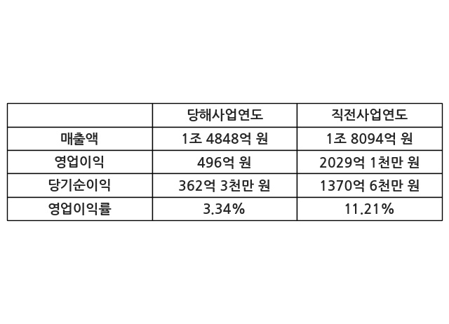 이번사업연도의 매출액은 직전사업연도 대비 -17.94% 감소한 1조 4848억 원, 영업이익은 496억 원, 당기순이익은 362억 3천만 원이라고 공시했다.