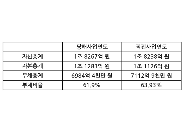 또한, 이번사업연도의 자산총계는 1조 8267억 원으로 직전사업연도 대비 0.16% 증가한 한편, 부채총계는 6984억 4천만 원으로 -1.81% 감소, 자본총계는 1조 1283억 원으로 1.41% 증가했다.