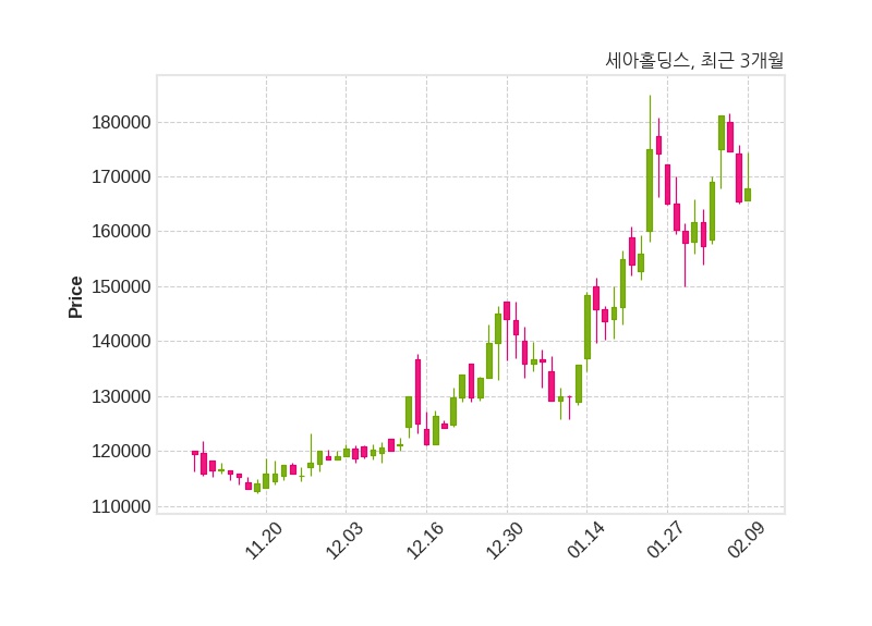 한편, 세아홀딩스는 장 마감 이후 해당 기업공시를 발표했으며 오늘 종가가 167,800원, 거래량은 1,469주로, 직전 거래일 대비 2,400원(+1.45%) 상승했다.